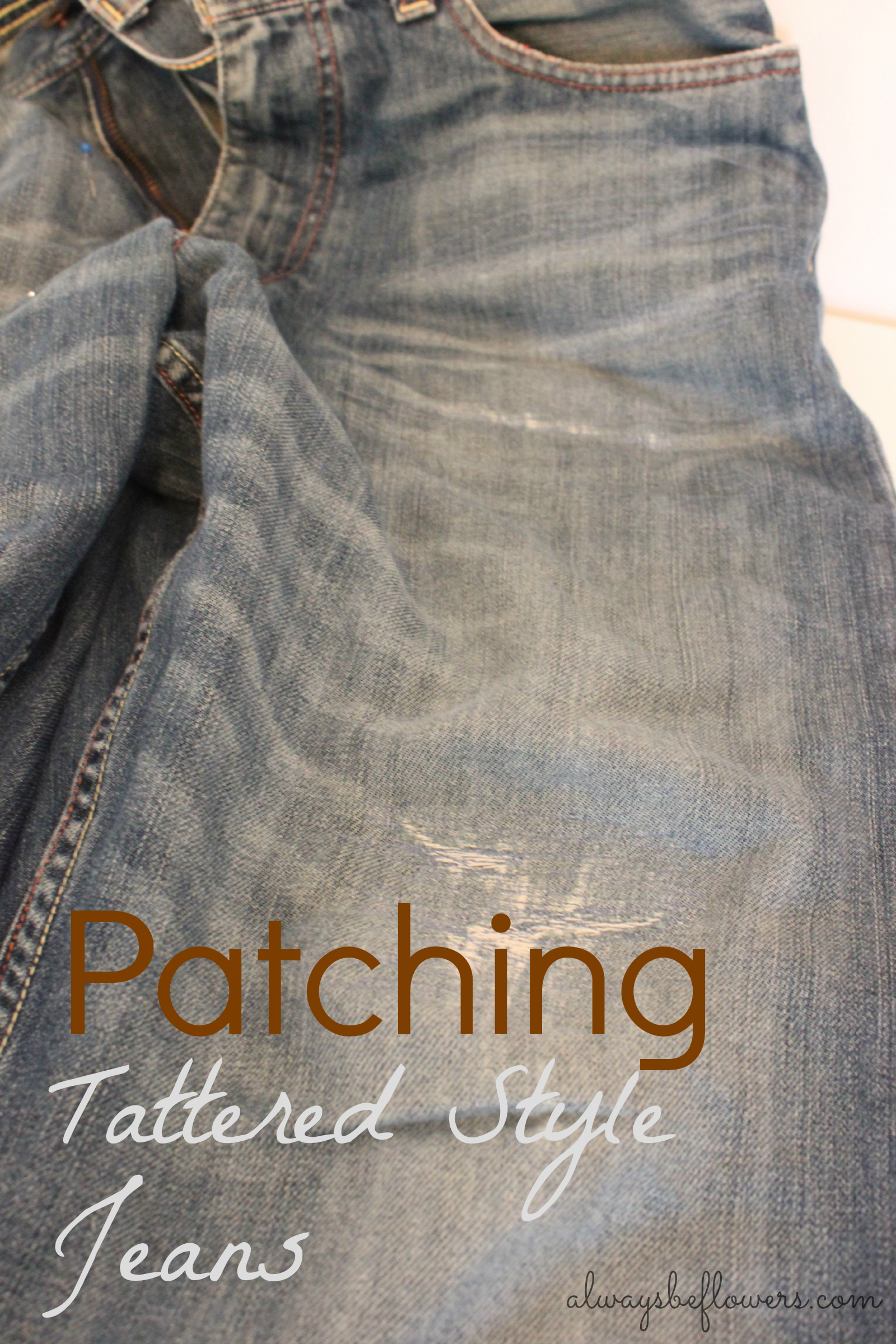 He has jeans are (apparently) perfectly broken in and he doesn't care what they look like. But I know that if he keeps wearing them in his usual fashion, the rips will get huge and render the jeans unfit for public display. After 3 pairs with at least 4 tears in each, I perfected the patching of the tattered style jean.
