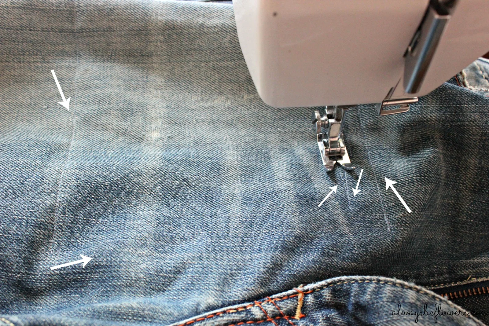 Next sew back and forth to secure the worn top piece of denim (the actual jeans) to the bottom. Use the reverse feature on the machine. Also, be certain to use a denim needle.